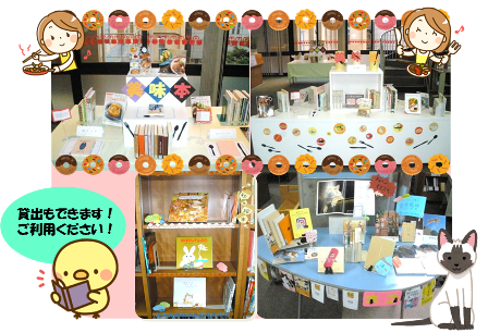 3階特設展示コーナー、ミニ展示コーナー、絵本書架にて、秋の図書展示を