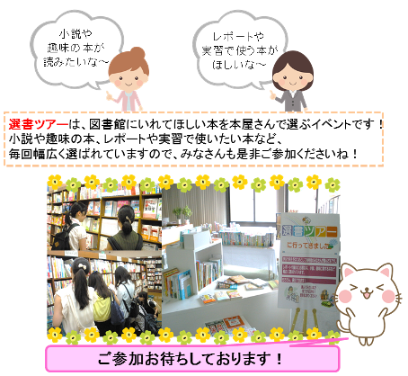 図書館では、図書館資料の充実をはかるために、下記の日程で選書ツアーを