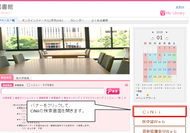 | ①本学のホームページを開いて、画面右側の【CiNii】のバナーをクリックしてください。 |