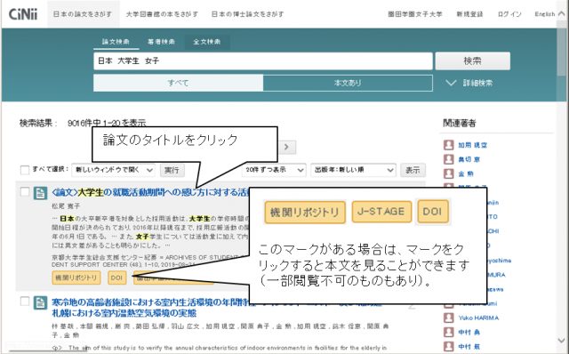 | ③ 検索結果の一覧が表示されますので、探している資料のタイトルをクリックします。 また、 [機関リポジトリ] [J-STAGE] [DOI] などのマークが表示されているものは、 マークをクリックすると本文を見ることができます(一部閲覧不可のものもあります)。 |