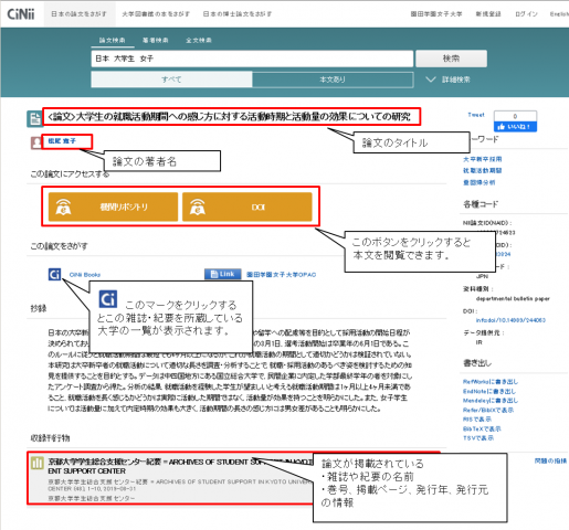 | ④ 詳細画面では、見たい論文がどんな雑誌・紀要に掲載されているか、誰が書いた論文なのか、などの情報を見ることができます。 「この論文にアクセスする」エリアにオレンジ色のボタンが表示されている場合は、クリックすれば本文を見ることができます。 論文が掲載されている雑誌・紀要をどこの大学が持っているかを見るときは、「この論文をさがす」エリアの[CiNii Books]のボタンをクリックします。 |