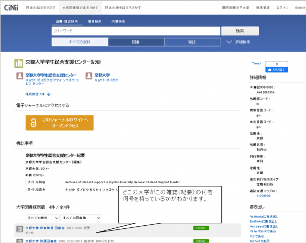 | ⑤ CiNii Booksで所蔵館を見た結果の例です。どこの大学が何巻何号を所蔵しているかが確認できます。 本学図書館にて所蔵している場合は、一覧の中に「園田大」と表示されています。 |