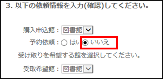 また、個研図書はお渡し準備ができましたら、今まで通りメールでご連絡しますので、「予約依頼」は【いいえ】を選択してください。