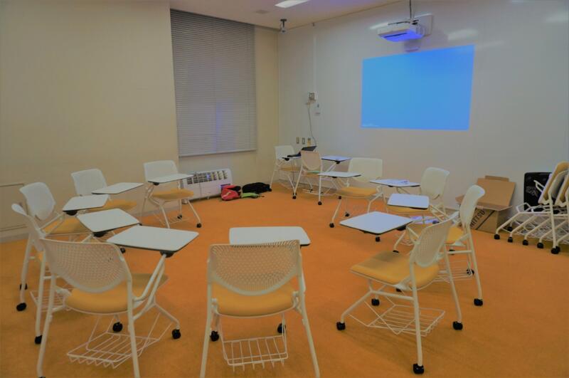 座席数:24席 学生のグループ用の学習スペースです。空いている時は 自由に利用できますが、事前に予約することもできます。 (予約受付は1週間前から) 予約の際は以下の内容をご確認ください。 【室内設備】 ・左右全壁面ホワイトボード ・プロジェクター(左右壁面に各1台) ・椅子24脚(テーブル付き、ネスティング可能) ※ノートPCの貸出を希望する場合はカウンターで お声かけください。 ※MacPCとプロジェクターを接続する場合、事前に ドライバー・ソフトウェアをダウンロードしてください。 https://www.epson.jp/support/portal/download/eb-1460ut.htm ※できるだけ実際に利用する時間で予約してください。 (場所確保のために長めに予約するのは ご遠慮ください。) ※学外の方はご利用いただけません。 【利用の際のお願い】 ・ 利用中はブラインドは上げておいてください。 ・ 声が大きくなり過ぎないようご配慮ください。 ・ 利用後は椅子等を元の状態に戻してください。 ご利用にあたり不明な点がありましたら、カウンターまで お問い合わせください。 | |