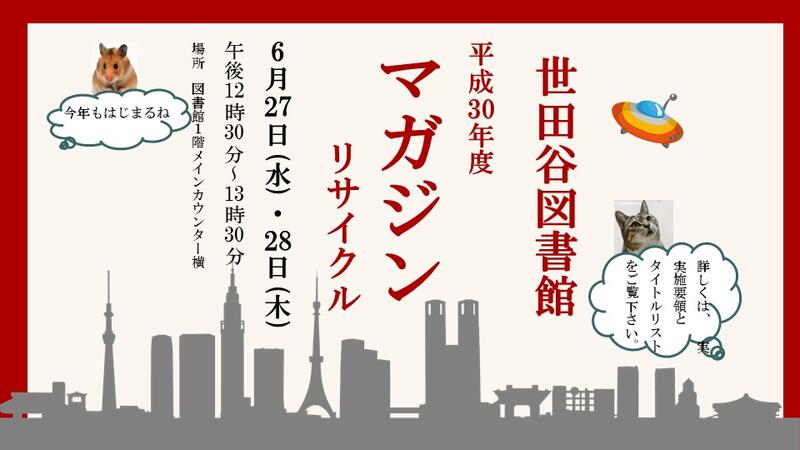 一覧へ 【終了しました】SC『2018年度マガジンリサイクル』開催のお知らせ 投稿日時: 2018/06/07 世田谷 世田谷キャンパス図書館では次の日程でマガジンリサイクルを実施します。 マガジンリサイクルは利用者サービスの一環として保存期間が終了となった雑誌を希望する学内の皆さんへ差し上げるという企画です。実施日時:2018年6月27日(水)・28日(木) 両日ともに12時30分から13時30分まで場所:世田谷キャンパス図書館1階 メインカウンター横実施要領とリサイクル対象の雑誌タイトルはこちら