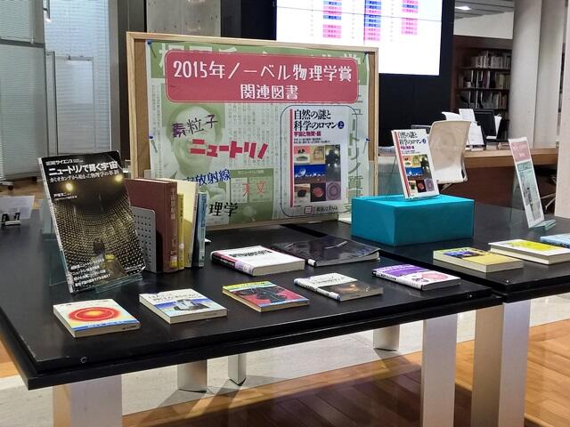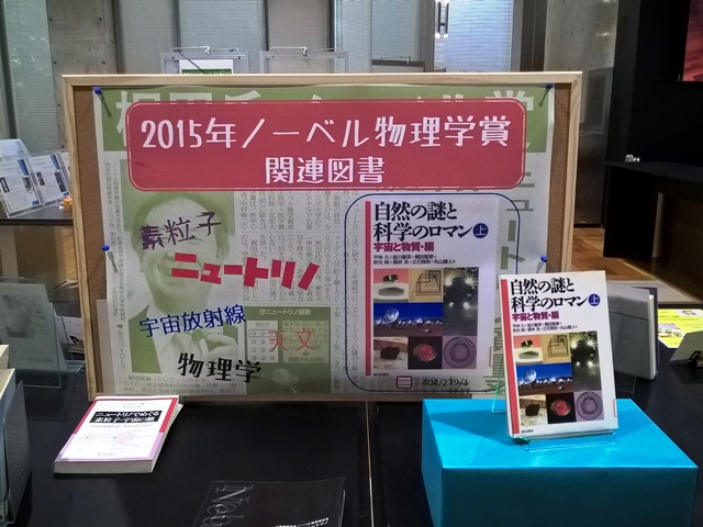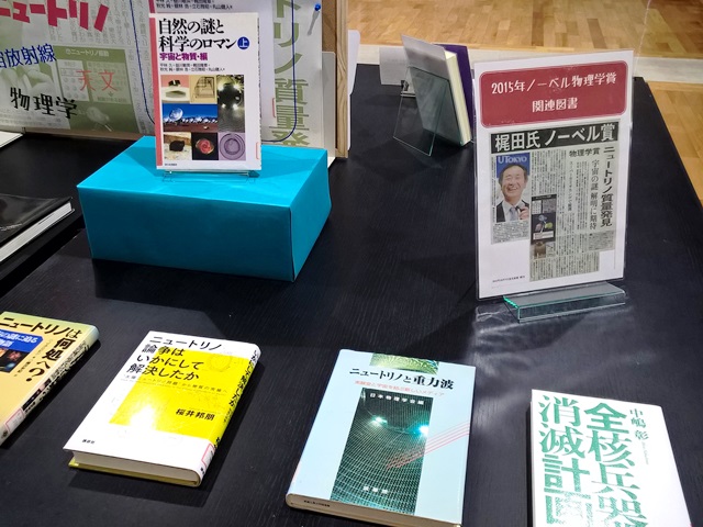 一覧へ 【終了しました】SC「ノーベル物理学賞関連図書」の展示 投稿日時: 2015/10/16 世田谷 今年のノーベル物理学賞は、ニュートリノが質量をもつことを示すニュートリノ振動を発見した東京大宇宙線研究所長の梶田隆章教授が受賞されました。現在世田谷キャンパス図書館では、昨年に引き続きノーベル物理学賞の関連図書を1階 TOSHOKAN Galleryで展示しています。 展示中の図書は貸出も可能です。どうぞご覧ください。