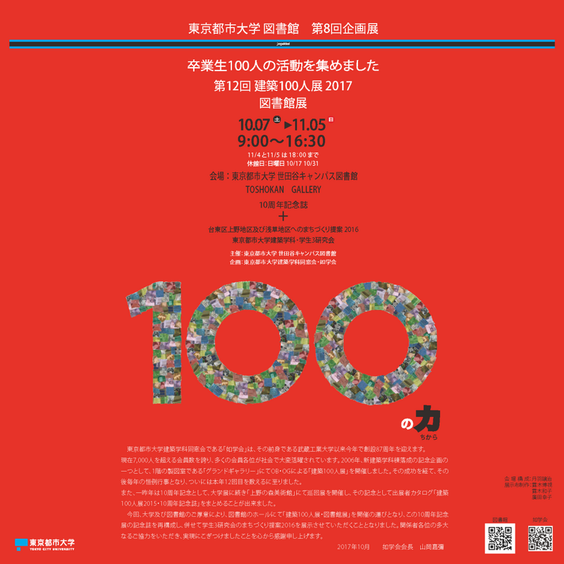 本展覧会は東京都市大学建築学科同窓会である「如学会」が企画し、建築学科卒業生100人の活動を紹介するものです。