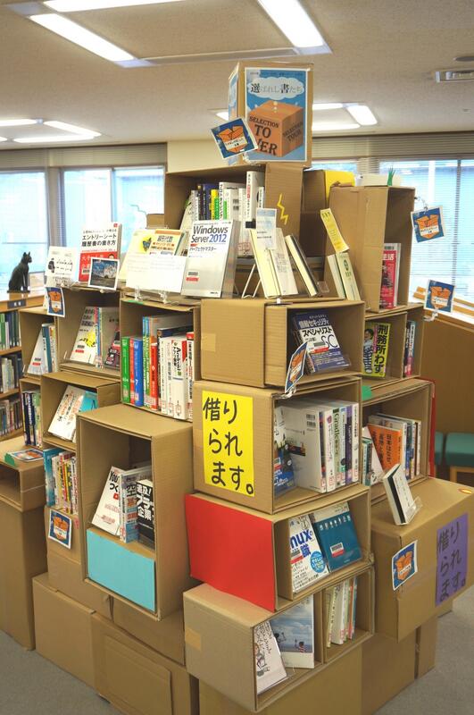 <展示コーナーは1階 入り口付近> <選書した14人+αの本棚があります。>