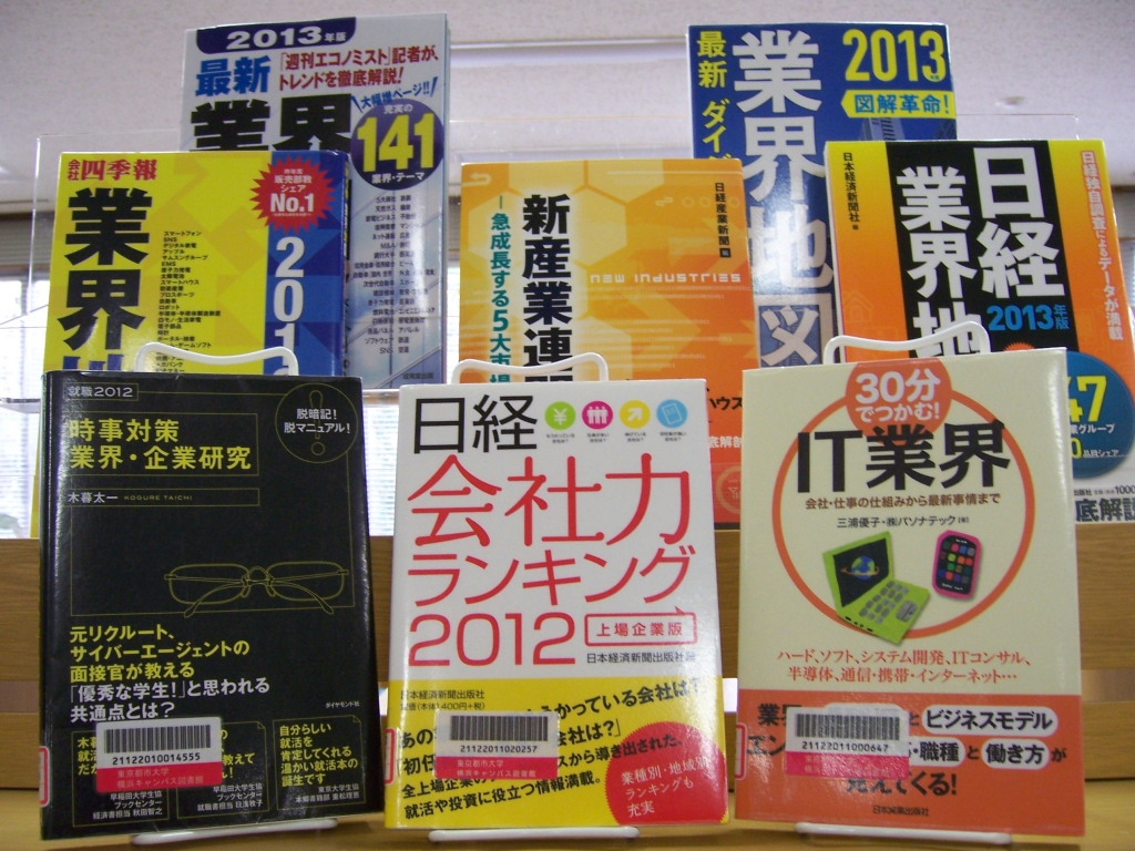 一覧へ 【終了しました】YC企画展示2012第6弾「業界を知ろう」開催中! 投稿日時: 2012/11/05 横浜 YC図書館企画展示第6弾のテーマは「業界を知ろう」です。図書館にも、業界研究に関する資料がたくさんあります。読書の秋に、じっくり業界への知識を深めるてみてはいかがでしょうか?また、「プロフェッショナル 仕事の流儀」等のDVDもあります。皆さんの就職活動に、ぜひご利用ください。★画像をクリックすると拡大します。 (関連リンク) ↓ Web 書棚はこちらからどうぞ↓※ブクログ:横浜キャンパス図書館の書棚