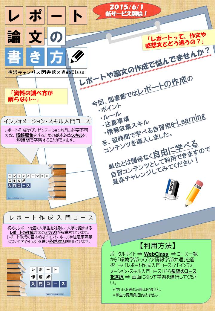 一覧へ YC レポート作成でお悩みの方必見! 投稿日時: 2015/06/01 横浜 「レポートって作文や感想文とどう違うの?」「資料集めって何から始めたらいいかわからない…」そんな悩めるあなたのために図書館では6月1日(月)よりレポートを書くための「レポート作成 入門コース」資料集めをするための「インフォメーションスキル 入門コース」のコンテンツを導入しました。ポータルサイトからWebClassにログオンすれば、自由に利用できます。ぜひ利用してみてください!
