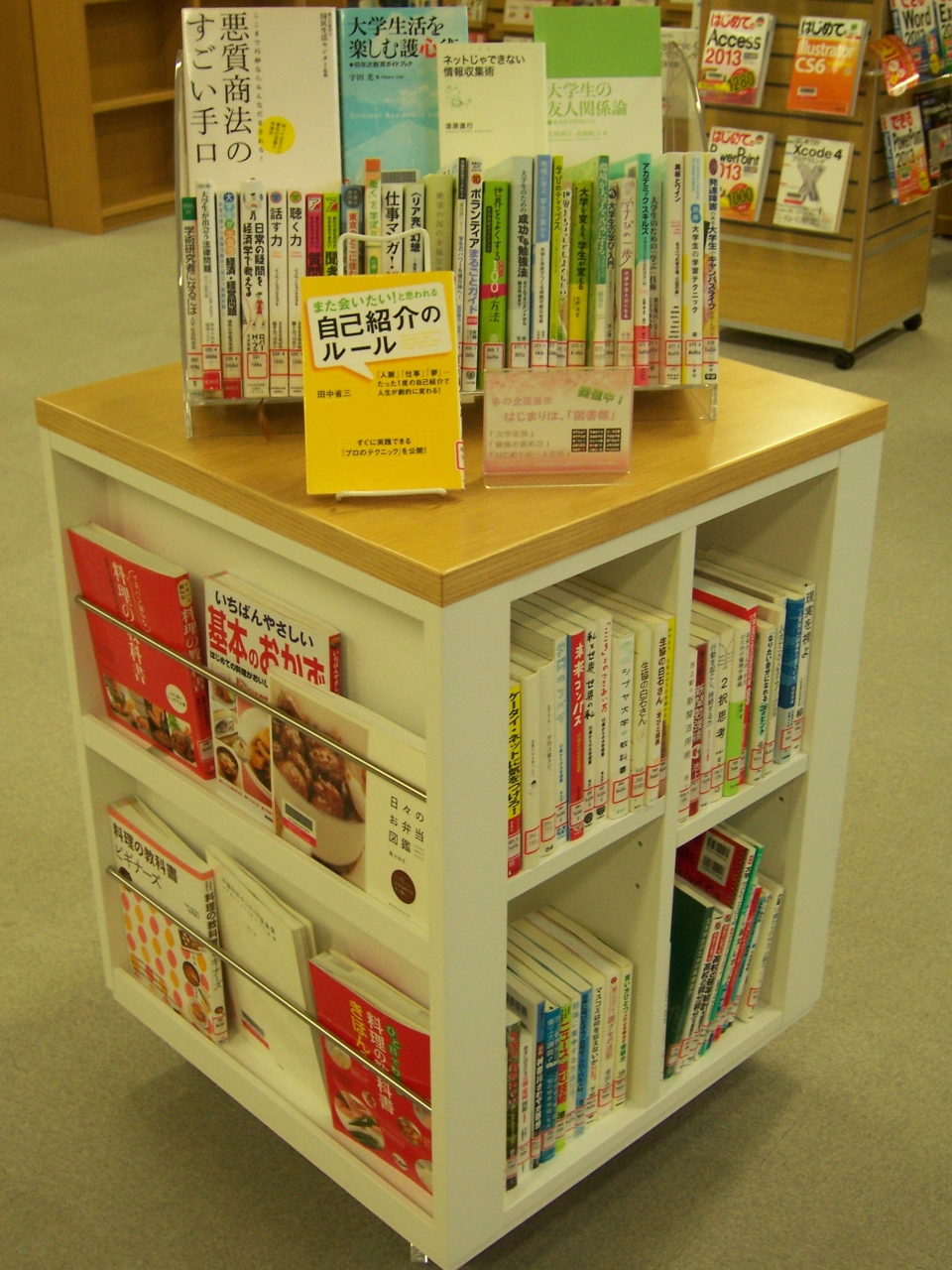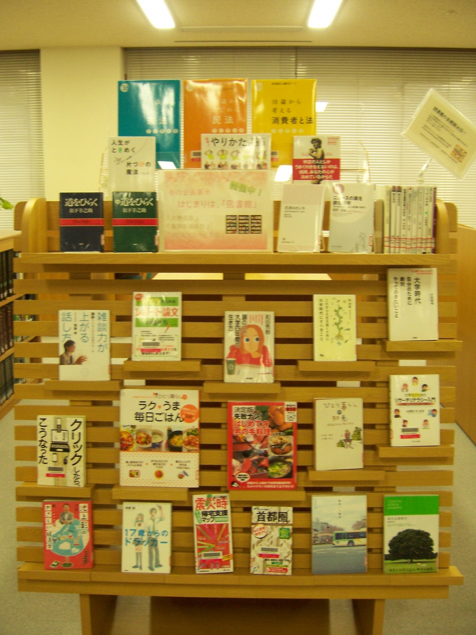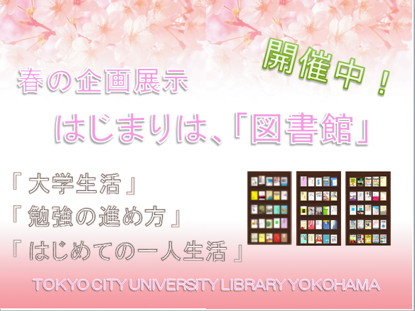 現在、横浜キャンパス図書館では1階展示コーナーで4月の企画展示 「はじまりは図書館」を開催しています。 主に新入生に向けて「大学生活」、「勉強の進め方」、「はじめての一人暮らし」などを テーマに展示中です。 ぜひご覧ください。 (関連リンク)※ブクログ:横浜キャンパス図書館のWeb本棚
