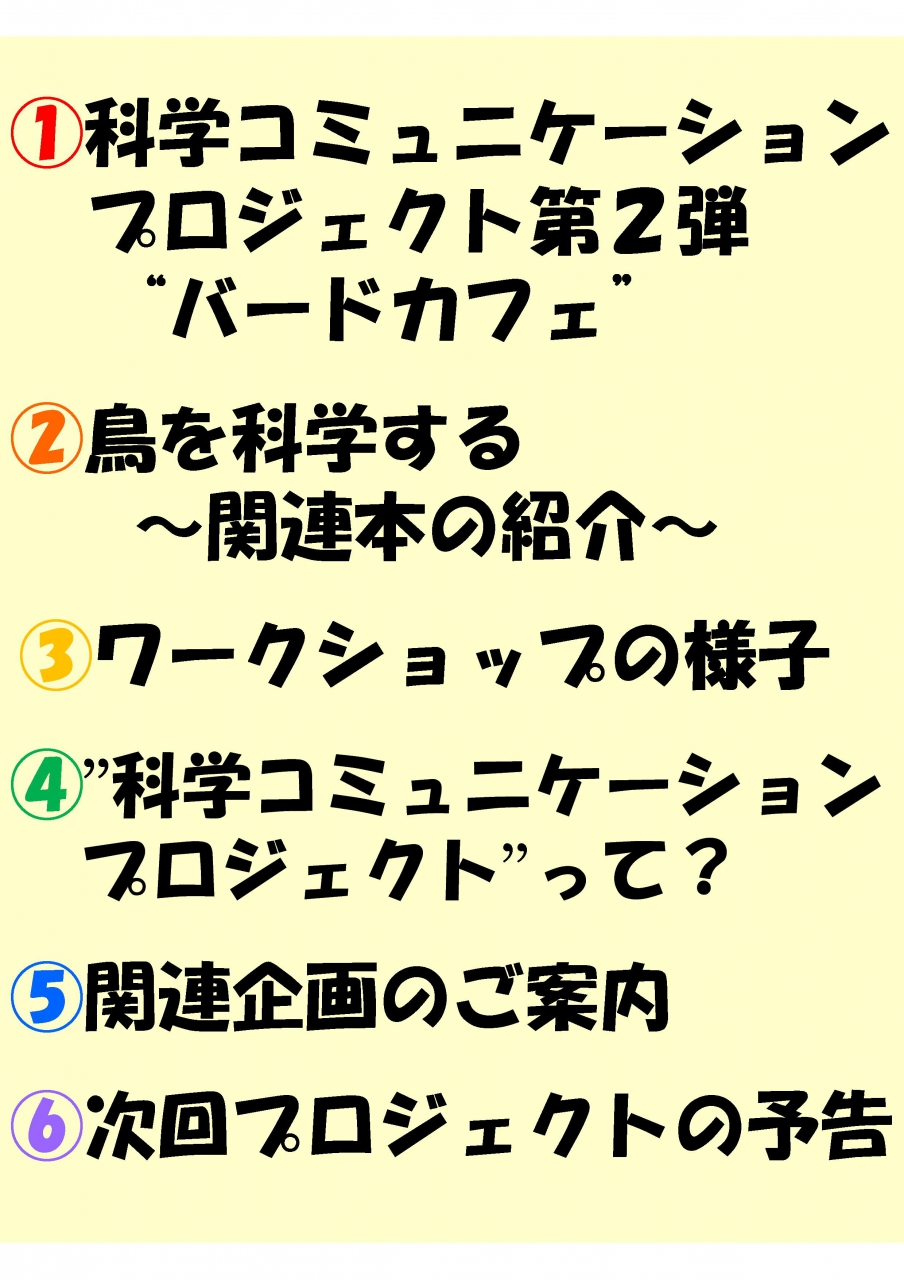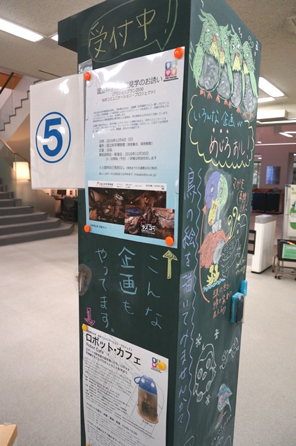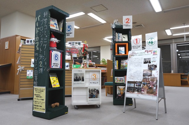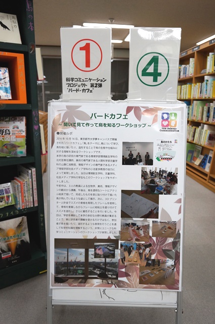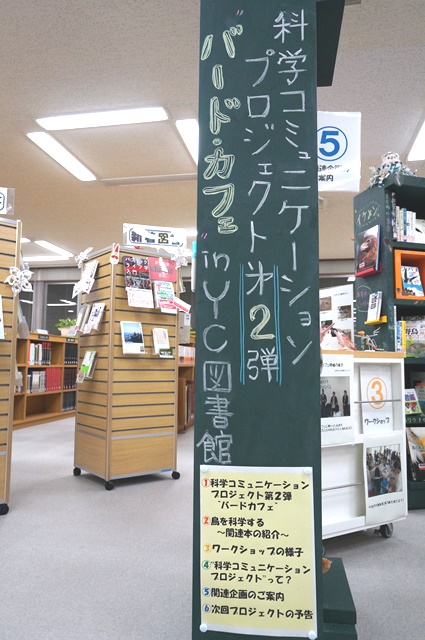 一覧へ 【終了しました】YC企画展示第6弾「科学コミュニケーションプロジェクトとのコラボ展示」 投稿日時: 2016/12/05 横浜 横浜キャンパス図書館では、10月16日に本学夢キャンパスで開催した 科学コミュニケーション・プロジェクトのサイエンス・カフェ第2弾 「バードカフェ 鳥のかたち」 とコラボした展示を開催中です。 全体を6つのテーマに分け、ポスター、本、作品などで、「バードカフェ 鳥のかたち」の 様子を紹介しています。 展示は12/10(土)までです。どうぞお立ち寄りください。 ←展示の説明はマグボットがしています。 ★バードカフェの詳細はこちらをどうぞ →「バードカフェ 鳥のかたち」