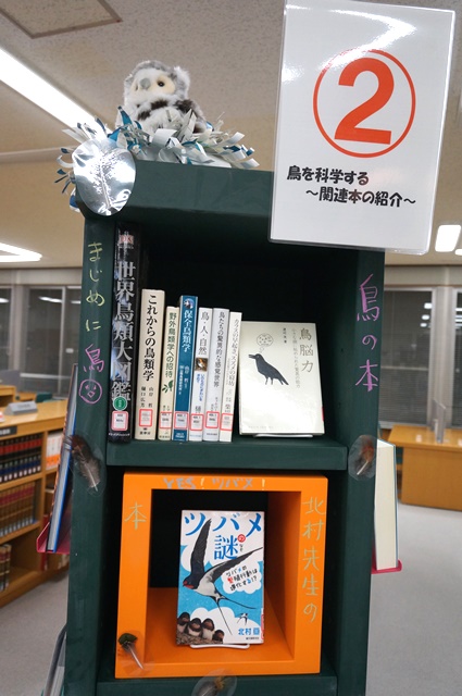 横浜キャンパス図書館では、10月16日に本学夢キャンパスで開催した 科学コミュニケーション・プロジェクトのサイエンス・カフェ第2弾 「バードカフェ 鳥のかたち」 とコラボした展示を開催中です。 全体を6つのテーマに分け、ポスター、本、作品などで、「バードカフェ 鳥のかたち」の 様子を紹介しています。 展示は12/10(土)までです。どうぞお立ち寄りください。 ←展示の説明はマグボットがしています。 ★バードカフェの詳細はこちらをどうぞ →「バードカフェ 鳥のかたち」