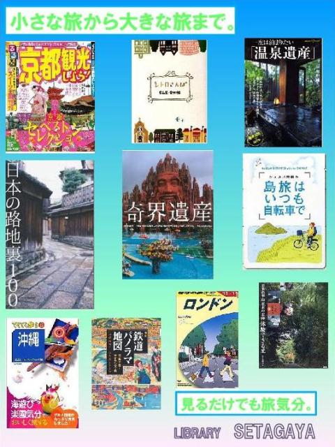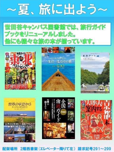 3キャンパス図書館には、様々な旅の本が揃っています。歴史・文化に触れる旅、食を楽しむ旅、エコ、路地裏、壮大な自然・・・旅のテーマは多種多様です。実際に訪れるのもよし、ページをめくって旅の気分を味わうのもよし、旅を通じて世界を開くと、新しい発見や出会いが待っています。この夏、図書館で、旅のヒントを見つけてみませんか?※写真は各キャンパスで作成したポスターです。クリックすると拡大します。