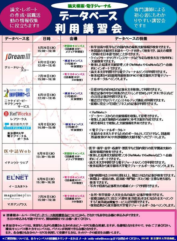 図書館では卒業研究や学術研究に役立つ論文記事検索や電子ジャーナルデータベースの利用講習会を開催します。