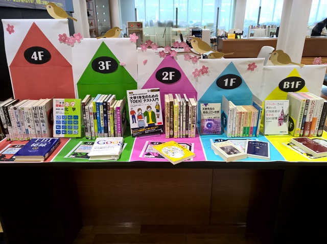世田谷キャンパス図書館では、図書館各階の本を一同に集めた展示。