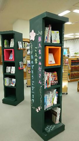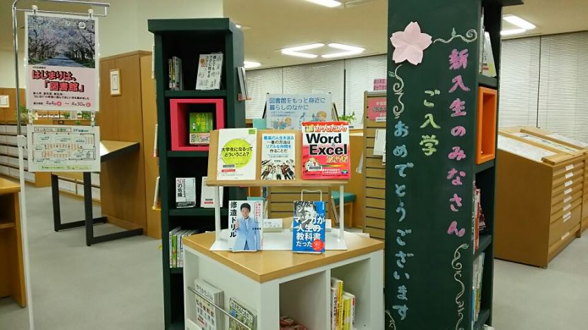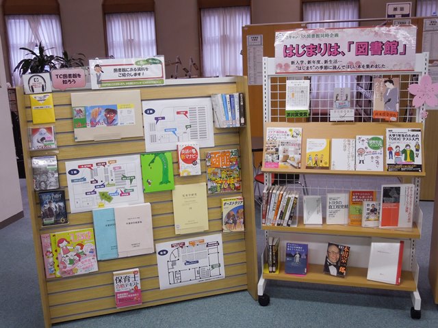 これからの学生生活に関わる資料はどこにあるか、図書館を探索出来るよう展示していました。
