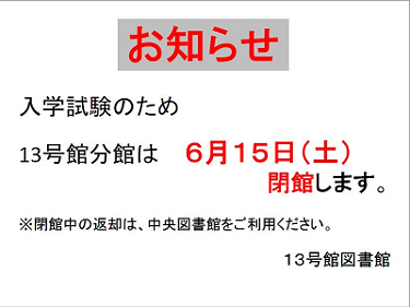 以下の日程で、入学試験(付属推薦・芸術学科)のため、13号館図書館は閉館となります。