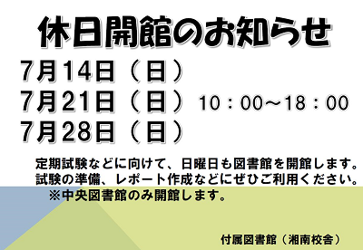 定期試験などに向けて、以下の日曜日に中央図書館を開館します。