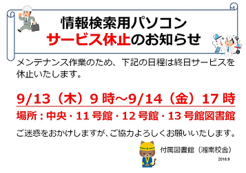 緊急メンテナンスのため、湘南校舎図書館4館全ての「情報検索用パソコン」
