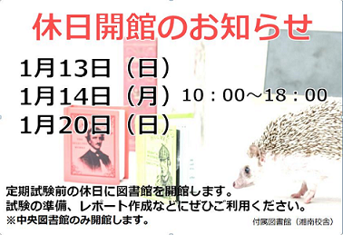 定期試験などに向けて、以下のとおり、日曜・祝日を開館します。